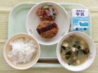 ~2月6日の献立~・牛乳・ごはん・コロッケ・野菜のゆかりあえ・なめのこみそ汁今日は、「11ぴきのねことあほうどり」という本から、コロッケを作りました。ひとつひとつ調理員さんの手作りです。