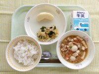 ~2月24日の献立~・牛乳・ごはん・たらのごまみそ焼き・ゆずあえ・じゃがいものみそ汁今日の副菜はゆずあえでした。ゆずが好きな児童、苦手な児童がいますが、全体的によく食べていました。