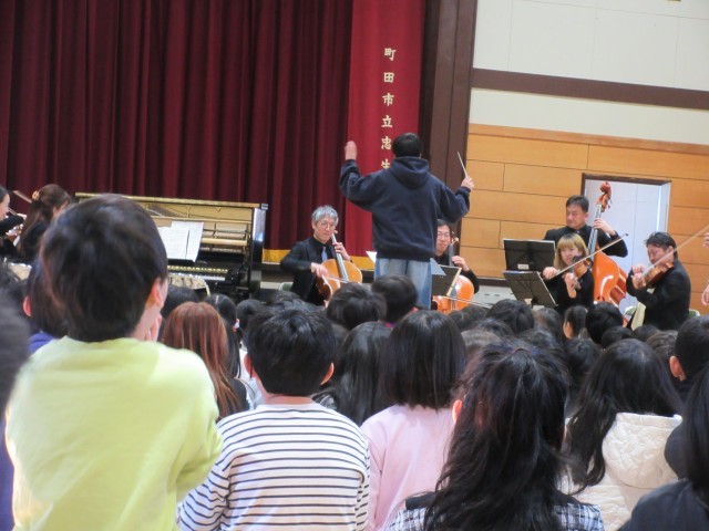 代表の児童が指揮の体験を行うなど、目で見て、耳で聴き、肌で感じる体験でした。