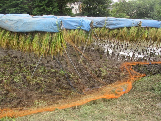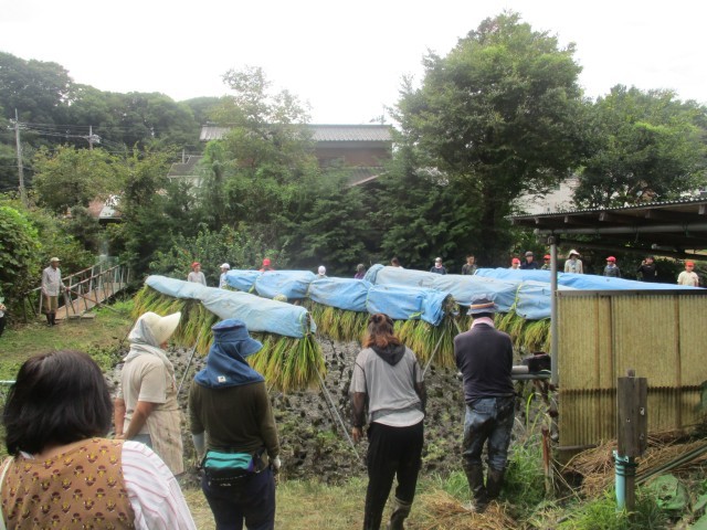 刈った稲を束ねて、干していきます。「はさがけ」