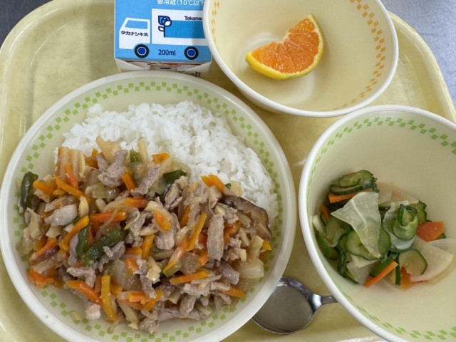 牛乳・チンジャオロース丼・華風きゅうり・みかん