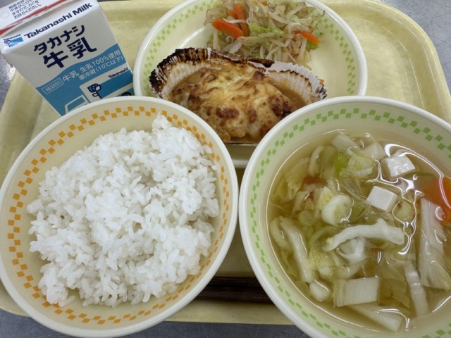 牛乳・ごはん・ホキのみそチーズ焼き・キャベツのゆず風味・すまし汁