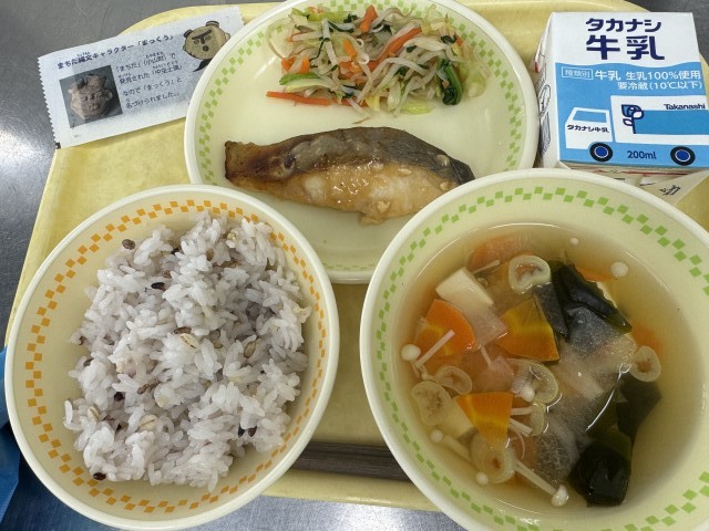 牛乳・古代米ごはん・銀さわらのみそ焼き・おひたし・季節野菜のすまし汁
