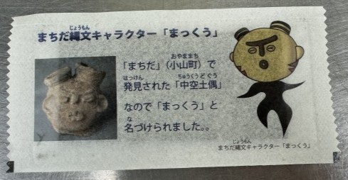 まちだ縄文キャラクター「まっくう」の印刷された味付け海苔と縄文時代から育てられていたと言われている赤米や黒米や季節の野菜を使って給食を作りました。