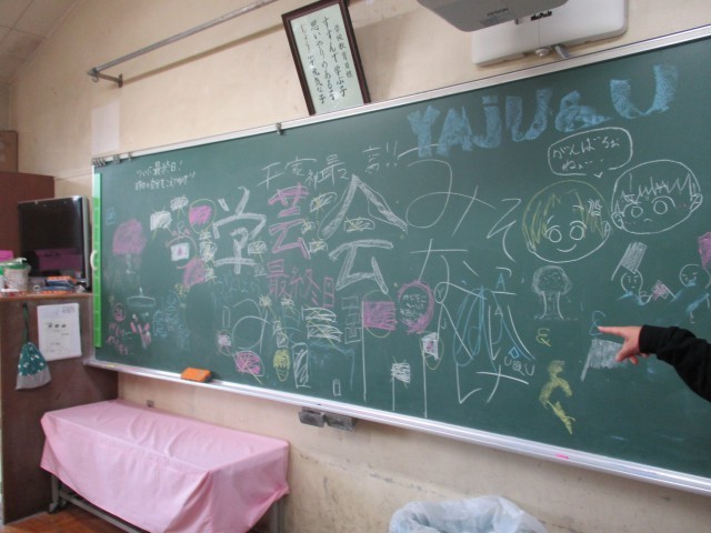 黒板に学芸会への思いをいっぱいにかいてありま