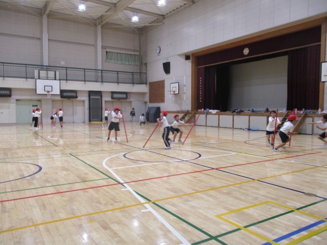 運動遊びで、立てた棒が倒れないうちに移動してキャッチ