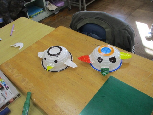 作品作りをしました。カップ麺の容器を使って、風でふわふわ