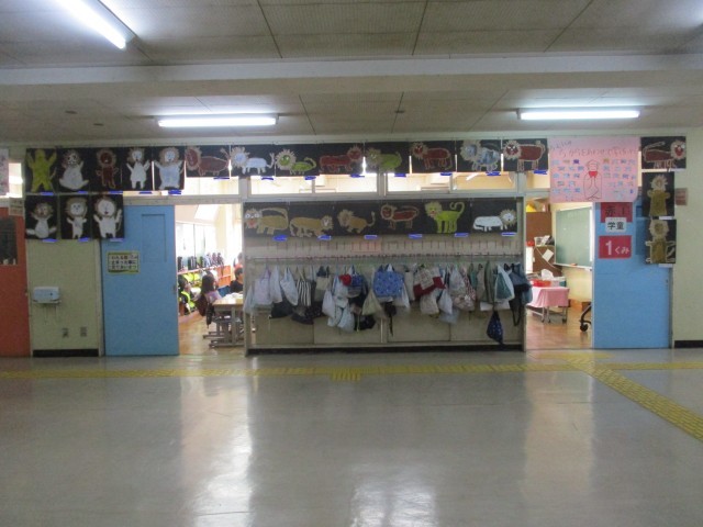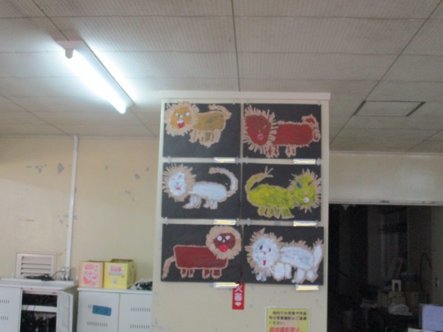 1年生のフロアには図工で描いたライオンがたくさん貼ってあります。