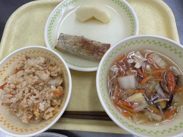 牛乳・キムたくごはん・棒ぎょうざ・五目スープ・りんご