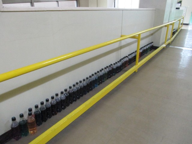 体育館に向かうスロープにペットボトルに色水を入れた