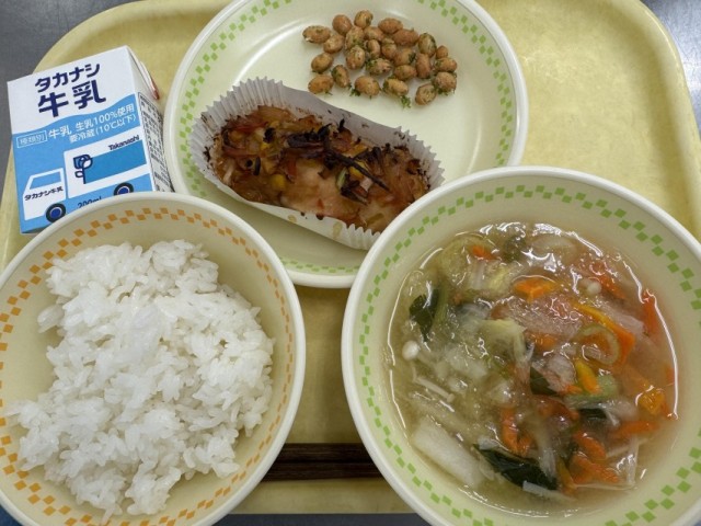 牛乳・ごはん・サケのちゃんちゃん焼き・青のりビーンズ・大根のおろし汁