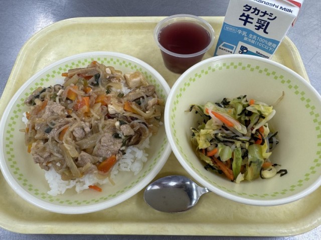 牛乳・豚すき丼・磯辺和え・つぶつぶブドウゼリー