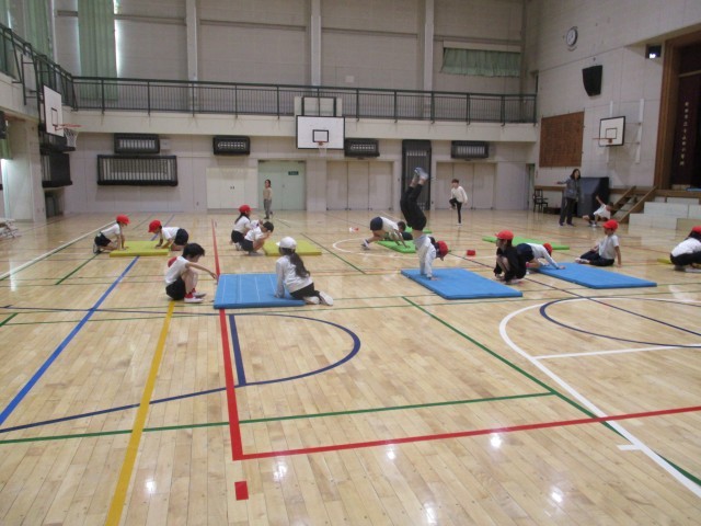 2年生はマット運動遊びで、倒立に近いことに挑戦していました。