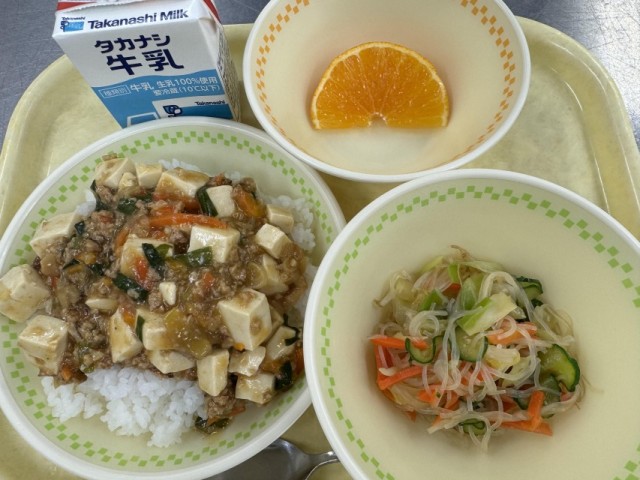 牛乳・麻婆豆腐丼・春雨サラダ・オレンジ