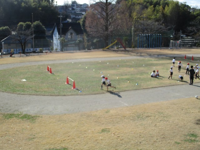 コーンやマーカーなど置いて場を工夫して取り組んでいま