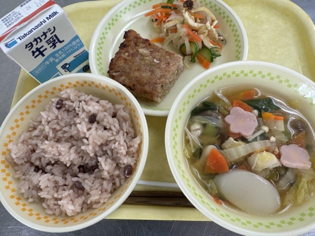 牛乳・お赤飯・松風焼き・紅白なます・もち入りお雑煮