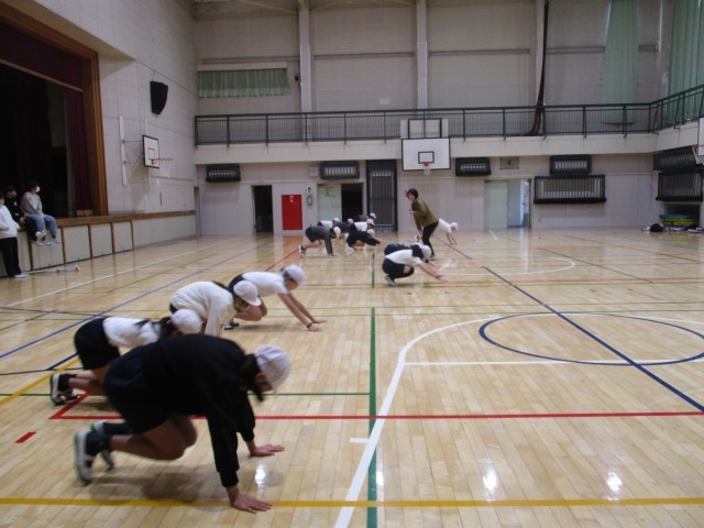 6年生体育館での体育の授業です。跳び箱運動の予備運動として