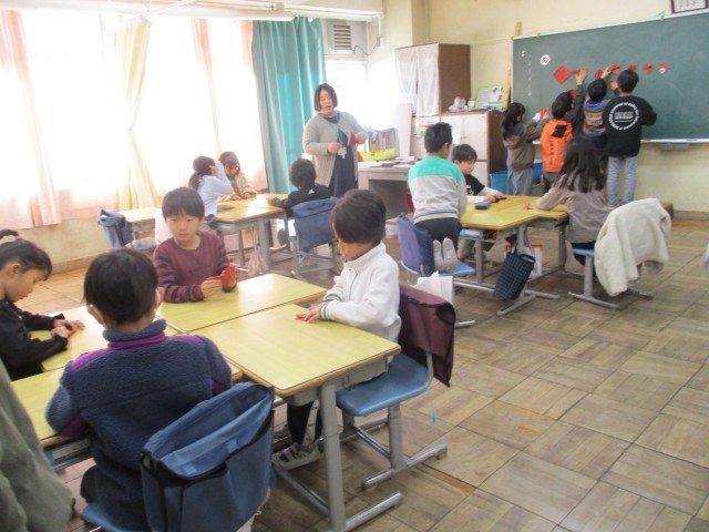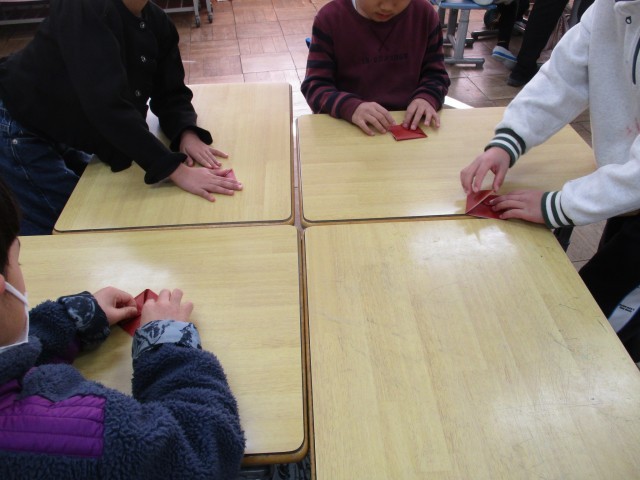 2年生は書初めの台紙の飾りを折り紙で作っていました。グループ