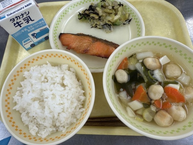 牛乳・ごはん・サケの西京焼き・青大豆とひじきのサラダ・すまし汁