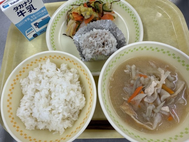 牛乳・ごはん・もち米シュウマイ・白菜とツナの昆布和え・大根のみそ汁