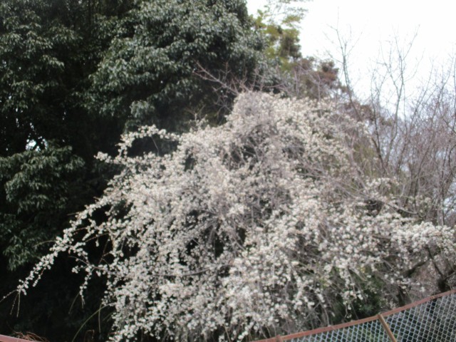 給食門の手前のしだれ梅です。1月の初めから花が咲き始め