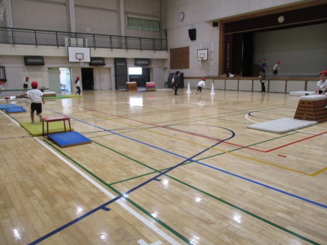 2年生の体育です。体育館でいろいろな用具を使って体力を