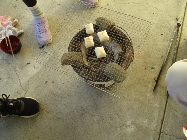 野外活動クラブは火を起こしてお餅を焼いていました。