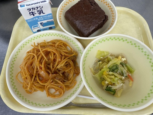 牛乳・ナポリタン・チーズサラダ・チョコケーキ