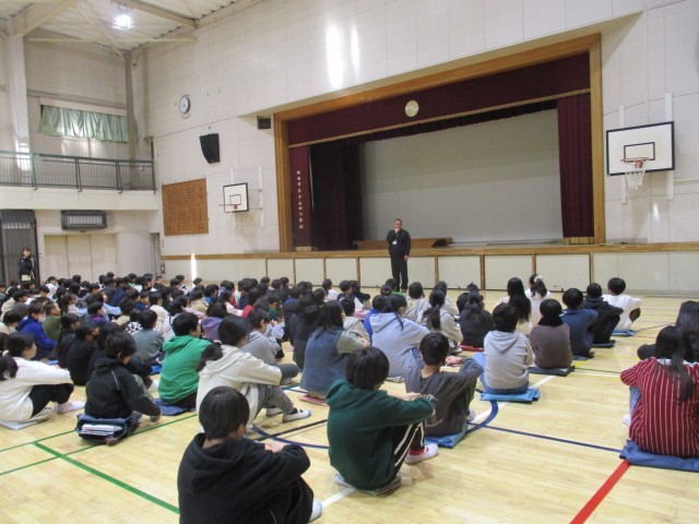 児童朝会は体育館で行いました。蛇口をひねれば水が出る、学校で