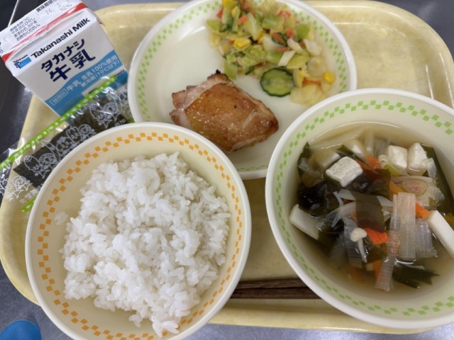牛乳・ごはん・味付けのり・鶏肉の麦みそマヨ焼き・ツナサラダ・和風わかめスープ