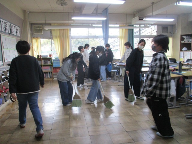 教室でも箒をもって並んで掃いていました。