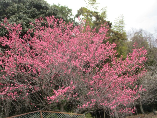 給食門からのスロープの紅梅(桃の木かも)が