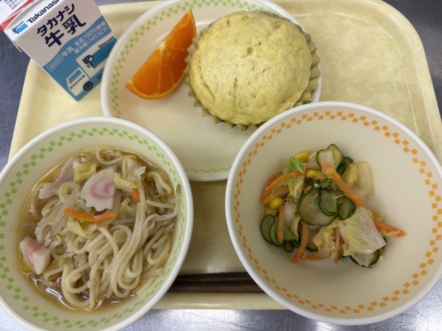 牛乳・しょうゆラーメン・カレー中華蒸しパン・ツナサラダ・オレンジ