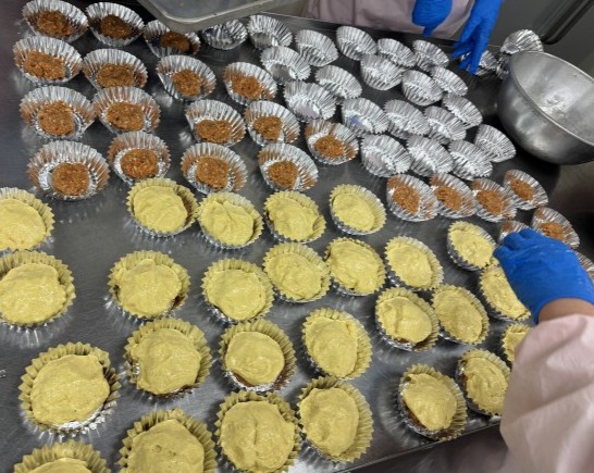 カレー味の肉あんに蒸しパン生地をかけて、蒸します。綺麗な色・形に蒸しあがって、安心しました。