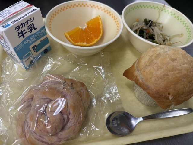 牛乳・いちごのロールパン・海藻サラダ・シチューポットパイ・オレンジ(でこぽん)