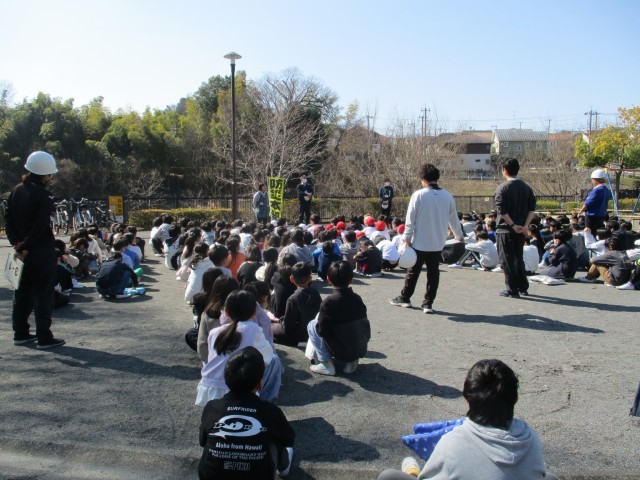 避難訓練です。予告なしの地震で、裏山が崩れるか