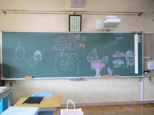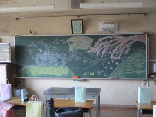 6年生が声出しに出た後の教室には黒板アートが描かれていました。