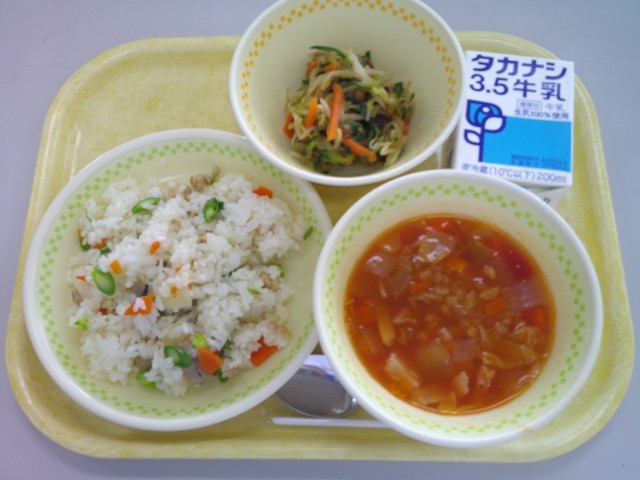 春野菜ピラフ 五穀サラダ ミネストローネ ぎゅうにゅう