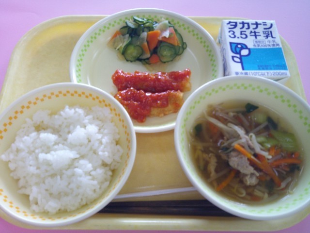 ごはん いかのチリソース 華風きゅうり 五目スープ 牛乳