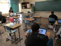 2時間続きの毛筆書写です。隣のクラスと1週おきに、2時間続きで書写の学習をしています。先生が用意した自作のデジタル教材で、筆の運びを確かめながら自分でも半紙に書きます。毛筆書写の時間は、いつもの授業以上に静かな時間で進んでいきます。
