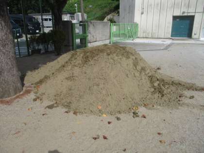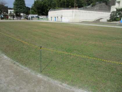 運動会が終わりました。校庭の芝生も少し休ませる養生期間に入ります。砂を撒き、冬芝の種を蒔きます。