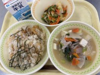 ごはん、サバの塩焼き、ごま和え、めった汁(石川県の郷土料理)