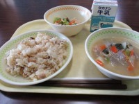 今日のごはんは、「さつまめごはん」です。油で揚げた大豆とさつまいもを甘辛く味付...