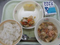 今日のメニューは、【牛乳、野沢菜とじゃこのチャーハン、コーンもやし、トックの中華たまごスープ】です。