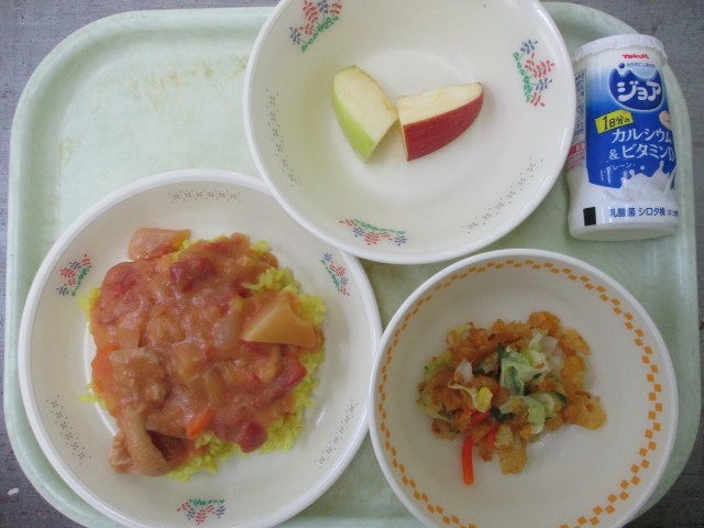 今日のメニューは、【ジョア(プレーン味)、ターメリックライスのトマトクリームソースがけ、カリカリコーンフレークサラダ、◇赤青りんごの食べ比べ(シナノスイート&ぐんま名月)】です。