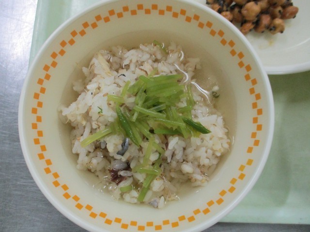 今日のメニューは、【牛乳、焼きさばと大葉のお茶漬け、豆かりんとう、ちくわときゅうりのおかかマヨ和え】です。