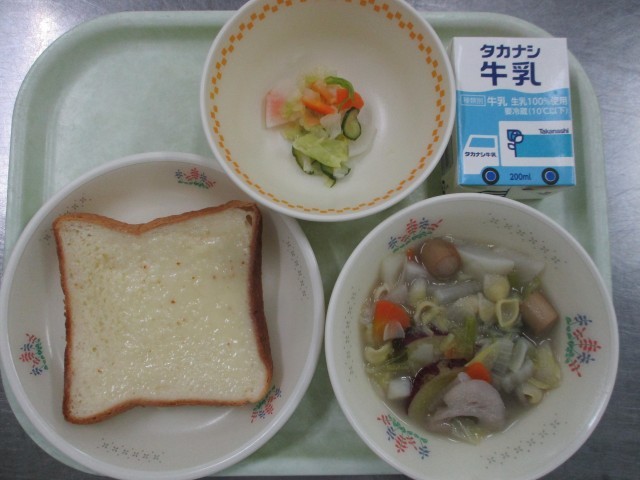 今日のメニューは、【牛乳、ミルキートースト、レモンドレッシングサラダ、冬野菜のあったかスープ】です。