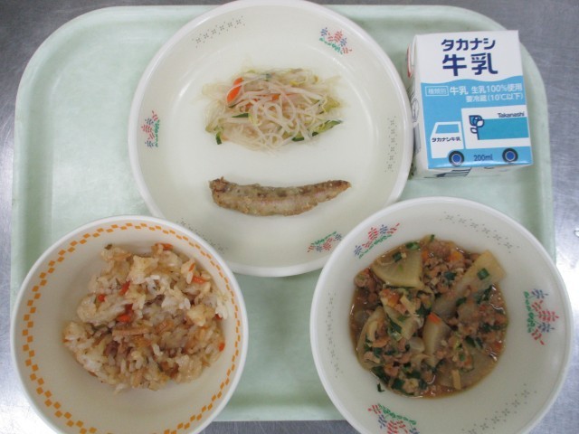 今日のメニューは、【牛乳、中華おこわ、◇まるごとマーボーだいこん、にぎすのからあげ、バンサンスー】です。