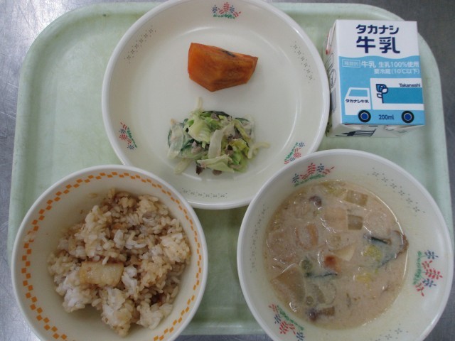 今日のメニューは、【牛乳、いか天ごはん、◇ツナとキャベツのいぶりがっこ和え、お麩のまろやか豆乳みそ汁、くだもの 柿】です。