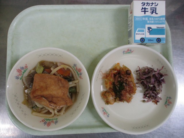 今日のメニューは、【牛乳、◇きつねうどん、たこぺったん、ゆかりもやし】です。
